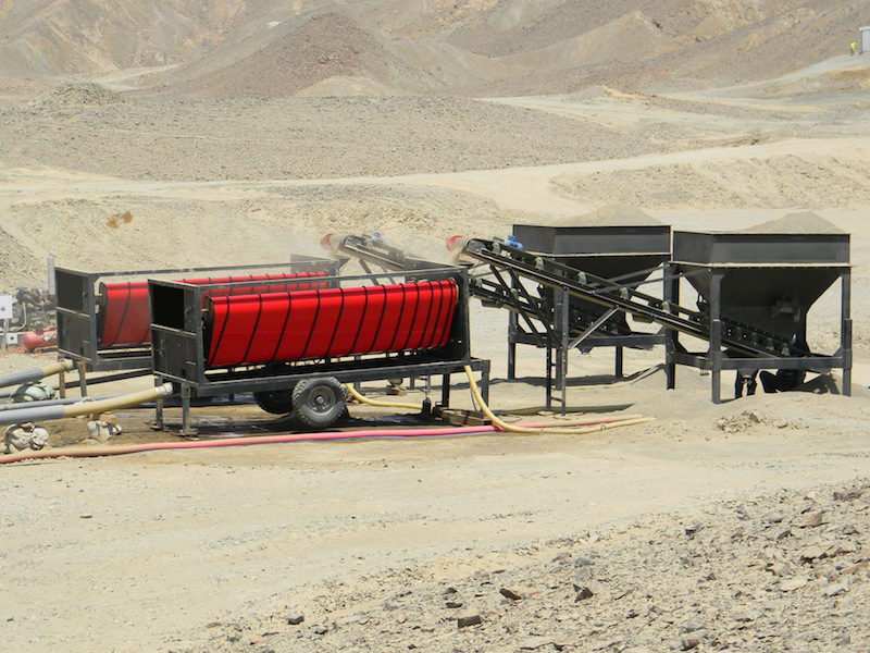 可采用挖掘機、鏟車、輸送機上料、也可定制為沙泵或翻斗車上料的料斗。料斗可配套格篩,將大石塊廢料隔出,以免對篩造成傷害。料斗可配套振動給料機、使礦料在進入滾筒式均勻、不間斷。小型淘金設備