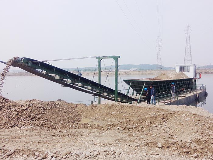 主要工作過程為:挖沙設備采集原料,輸送到運輸船儲料倉,然后經過運輸船到岸邊,用輸送帶輸送到陸地上。