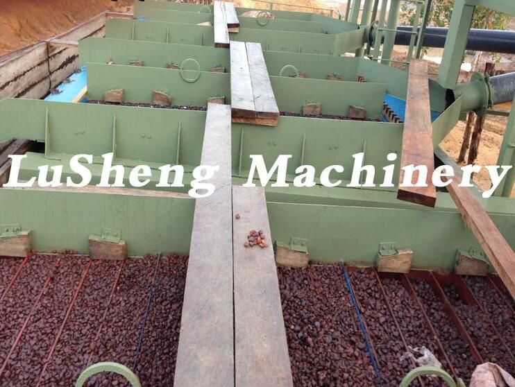 小于8mm的物料經(jīng)螺旋輸送機輸送至料倉與細(xì)碎后的物料混合。料倉下設(shè)置自動給料裝置,將物料均勻給入往復(fù)式循環(huán)溜槽,往復(fù)式循環(huán)溜槽作為重選流程的設(shè)備,其作用就是將錫石和廢石分離,取得高純度的錫石,拋棄不含錫的廢石,達(dá)到選礦提純的目的。該設(shè)備自動排礦精礦則直接進(jìn)入精礦池。尾礦自動排棄。選鉭鈮礦設(shè)備