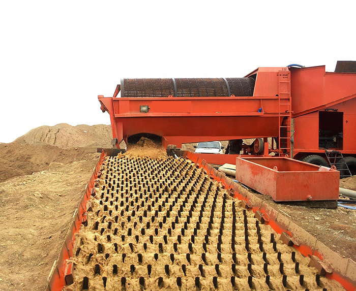 采用輪式底架,可牽引車(chē)拖拽,特點(diǎn)為:移動(dòng)方便,處理量大,一體化設(shè)計(jì),簡(jiǎn)單。本設(shè)備可以根據(jù)客戶(hù)的要求單獨(dú)加工,或根據(jù)原礦類(lèi)型及砂金顆粒類(lèi)型配備鼓動(dòng)溜槽、固定溜槽、蠕動(dòng)溜槽、水套離心機(jī)等設(shè)備收集沙金。