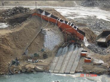 2、采用偏心軸振動篩進行篩分。粗料篩出后直接排走。 細料根據礦體情況選配:離心選礦機、鼓動溜槽、蠕動溜槽、振動溜槽等選金設備。