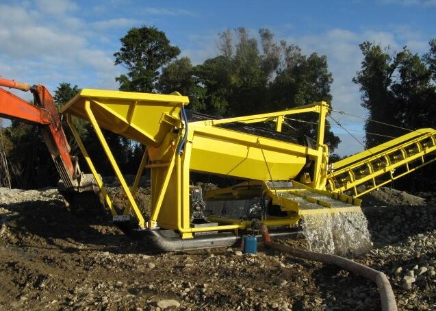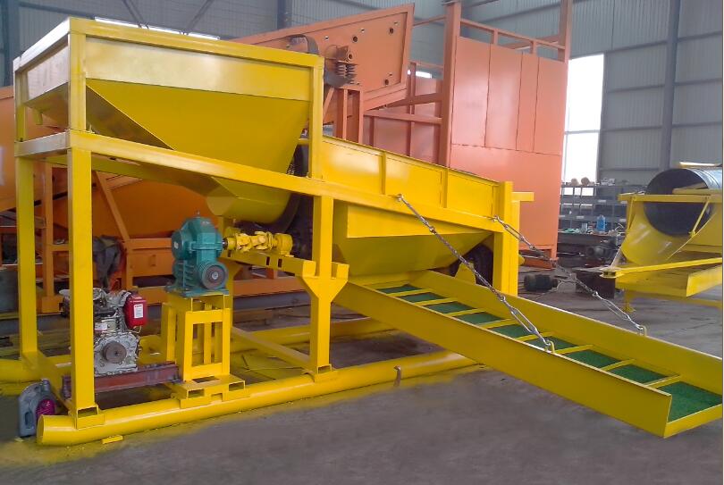 一種小型沙金機械 小型的沙金機械有移動式的,有滾筒式的,這種在沙金礦開采中移動比較方便,篩分、洗礦、黃金回收作用一個不少,只是產量稍微小了點??梢圆捎眯⌒偷墓こ虣C械來配合給料,采用小型的水泵來供水。這種設備生產成本低。