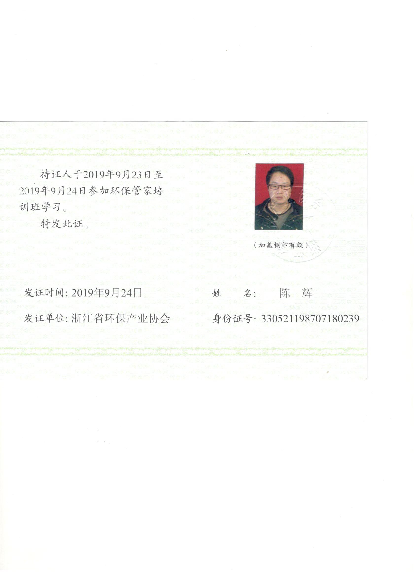 環(huán)保管家證書(陳輝)