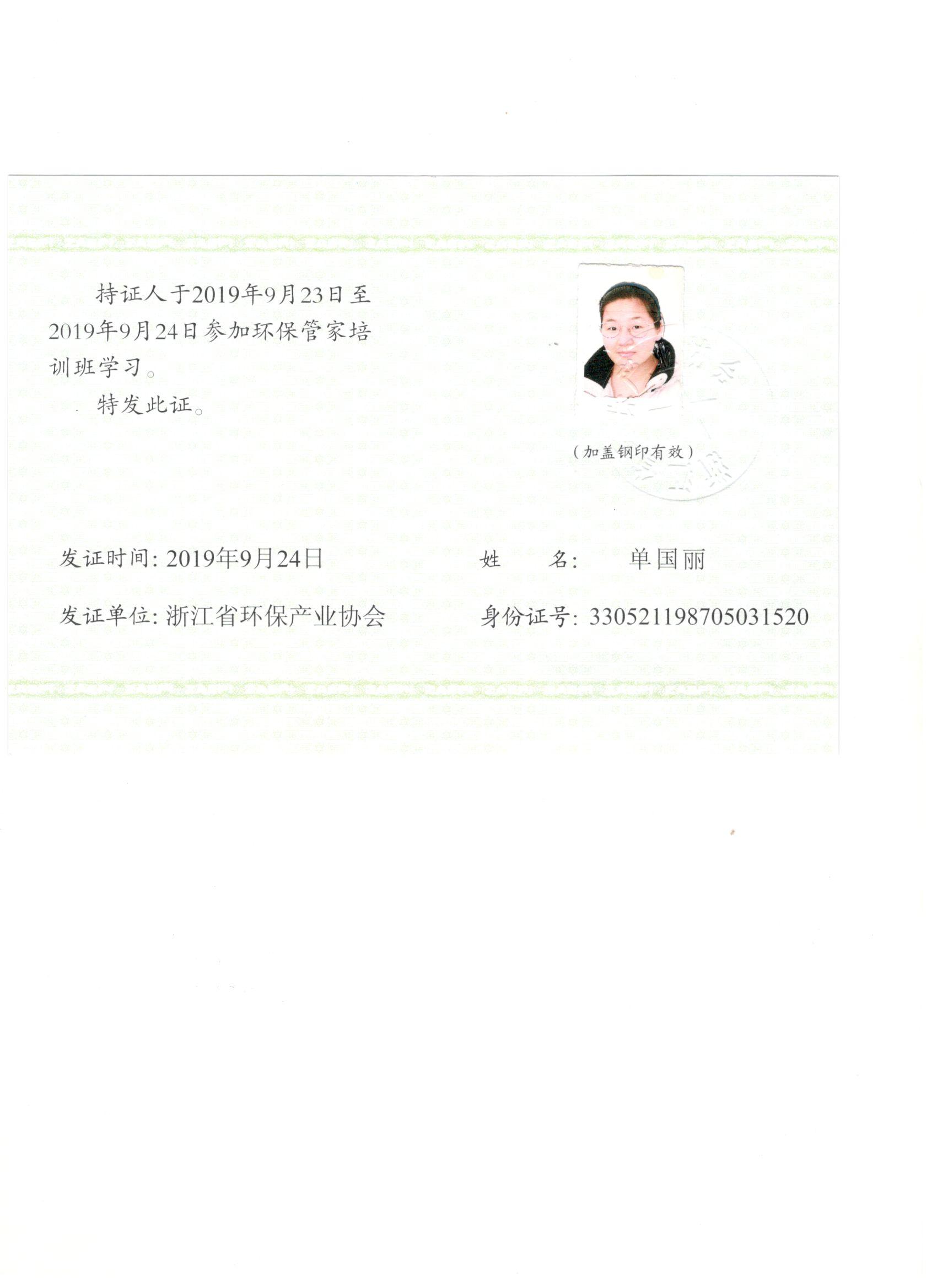 環(huán)保管家證書(單國麗)